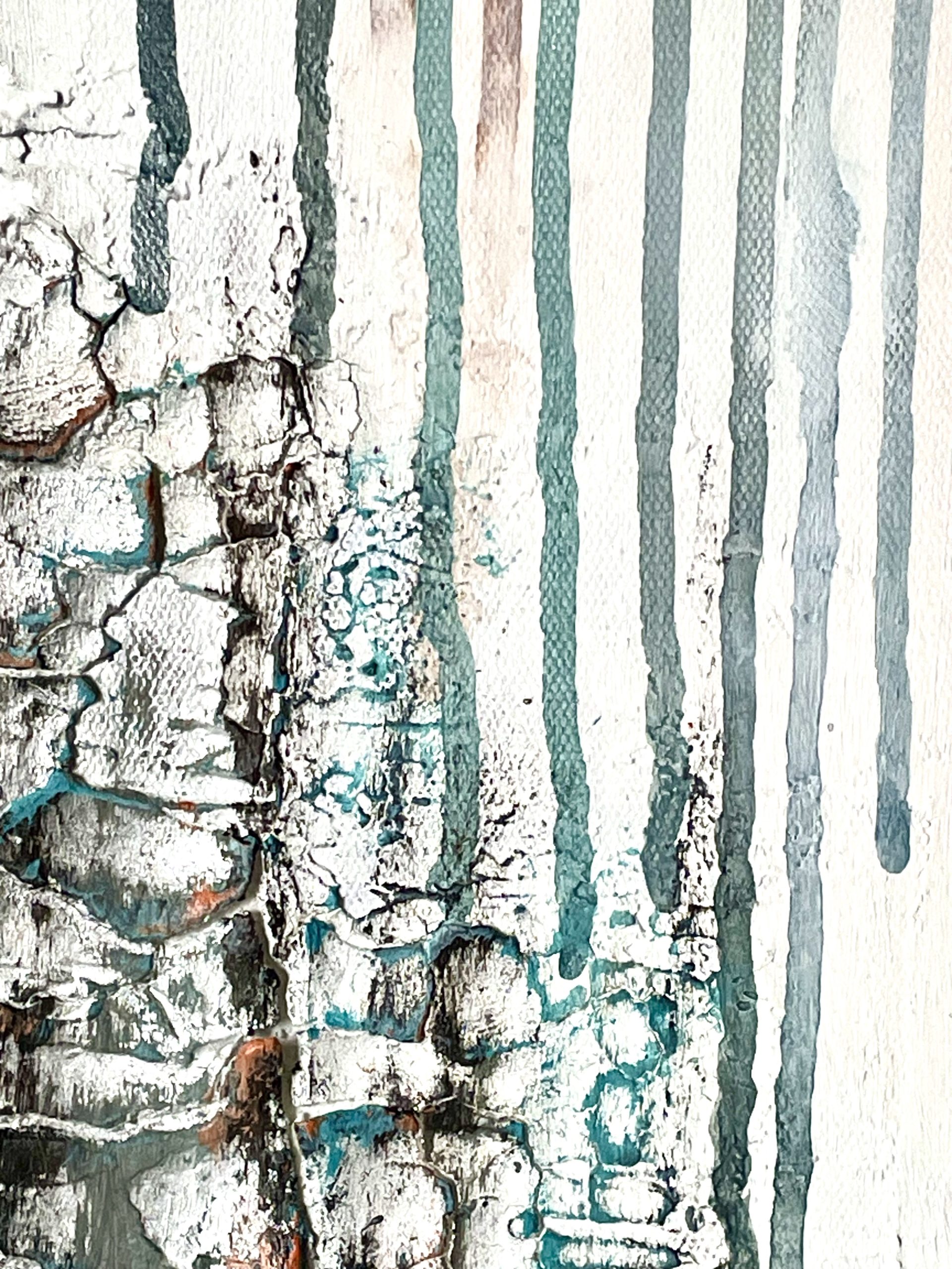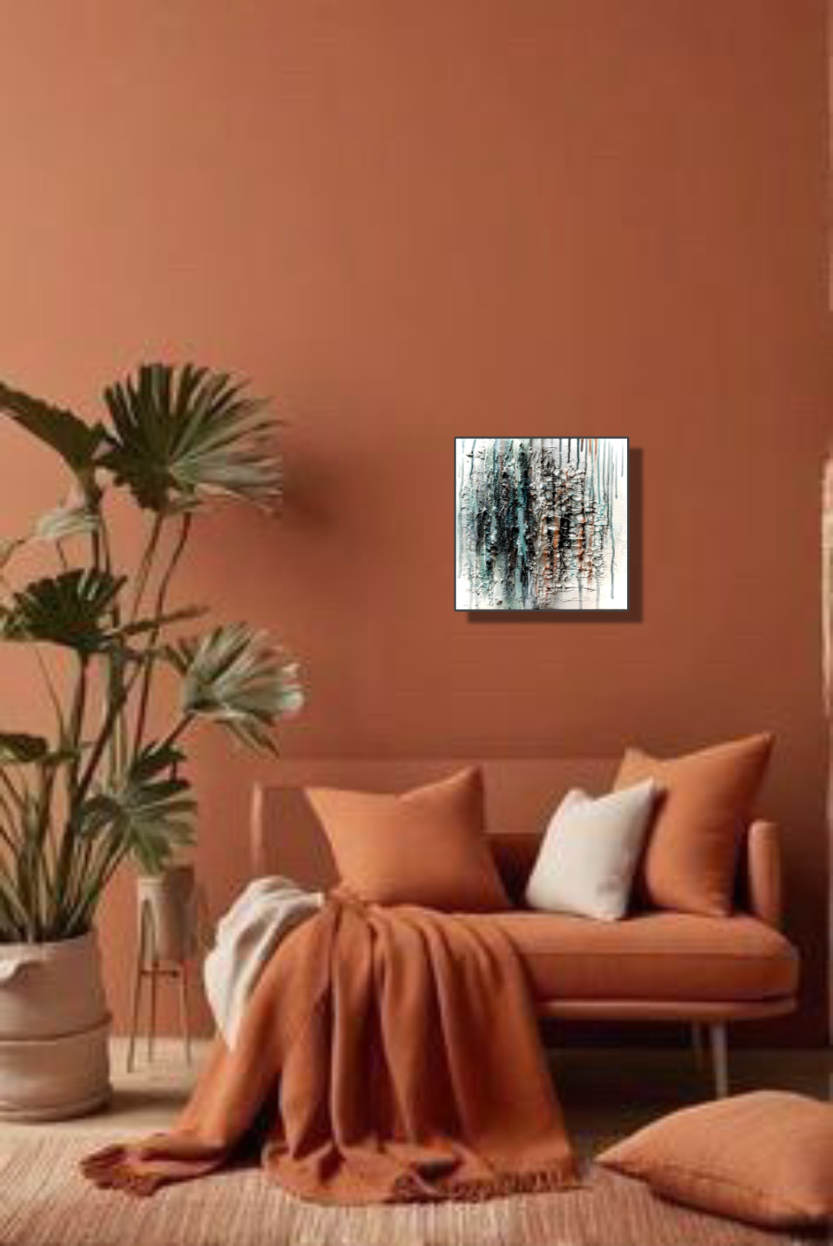 Вы чувствуете, как внутри борются два начала? Рацио требует порядка и контроля, а интуиция шепчет: «отпусти, доверься потоку». Картина «Единство» — это визуальный диалог, который гармонизирует эти полярности. На белом холсте размером 40×40 см разворачивается история баланса: слева — мужское начало с ритмичными вертикалями коры в холодных серо-голубых тонах, символизирующее структуру и устремление вверх; справа — женское начало с трещинами и потёками в жизненной бирюзе и оранжевом, олицетворяющее творческий хаос и свободу. Их разделяет серебряная полоса — неразрывная связь, превращающая конфликт в танец.
