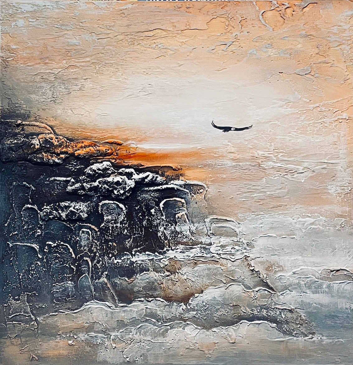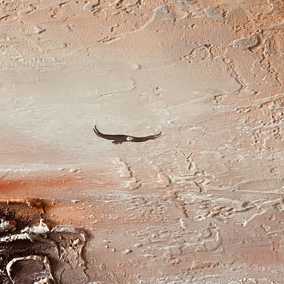 Горы рождались из басовых частот, облака — из высоких обертонов, а орёл появлялся там, где мелодия достигала пика свободы. Я не смешивала краски — я направляла энергию, которую давало мне это особенное, почти ритуальное сочетание медитации и музыки.