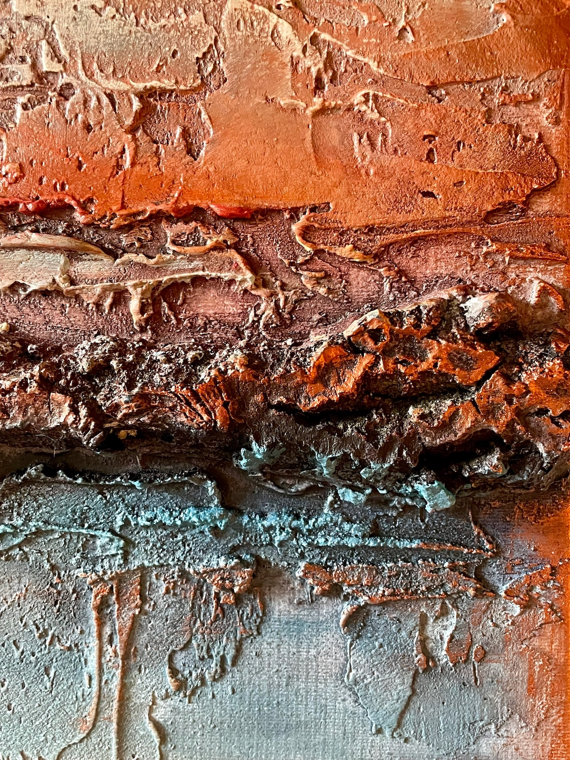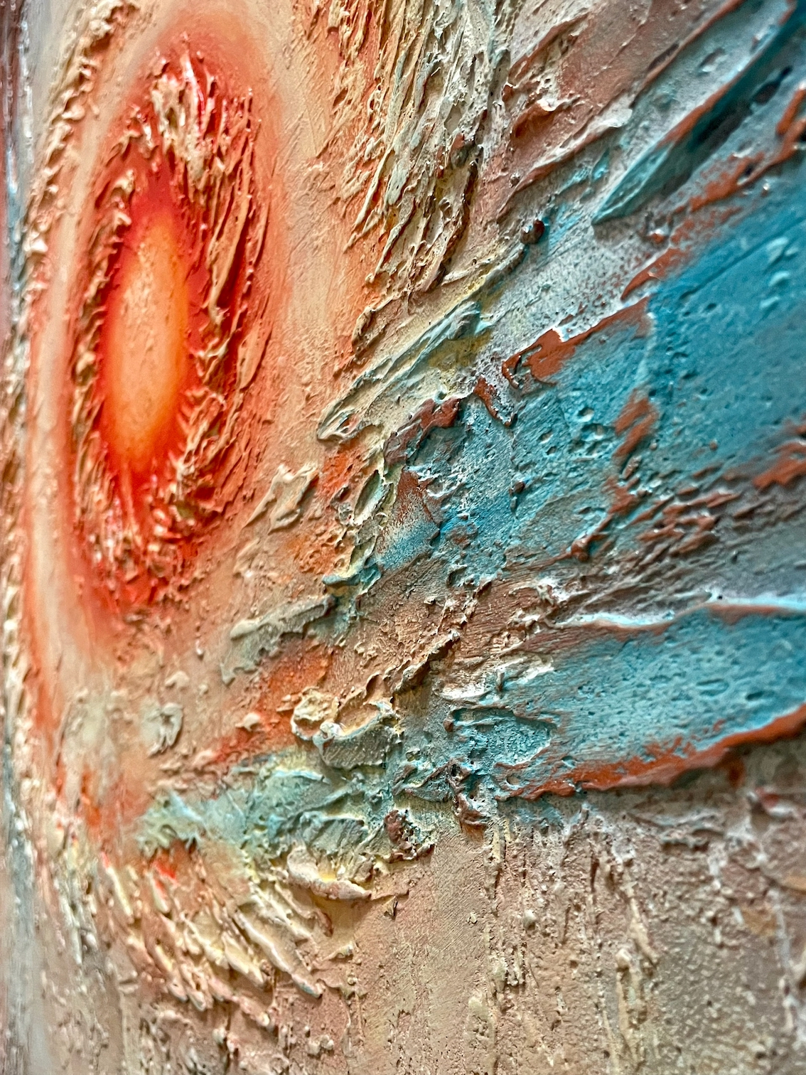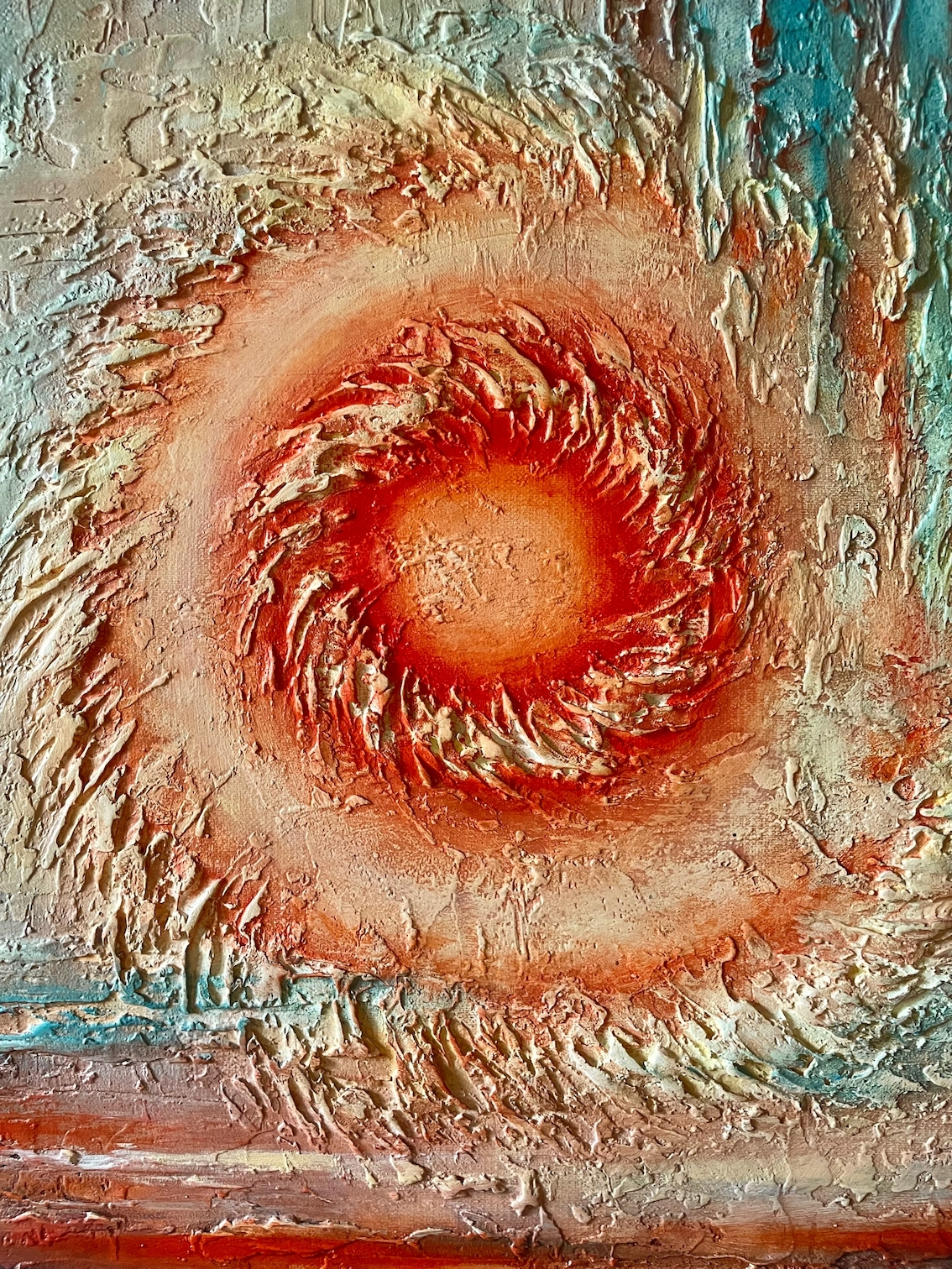 Авторская техника с использованием меди и фактурных паст создаёт тактильную ценность, которая приковывает взгляд и увеличивает инвестиционную привлекательность. Двойной вихрь солнца — это метафора сконцентрированной энергии и экспансии. Работа для тех, кто покупает не просто декор, а символы силы.